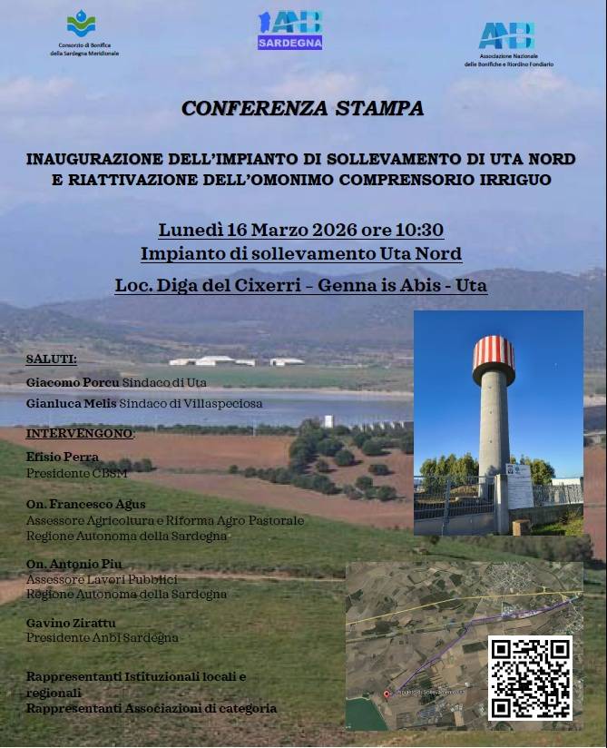 Lunedì 16 marzo alle ore 10:30, presso l’Impianto di Sollevamento di Uta Nord (località Diga del Cixerri – Genna Is Abis), si terrà l’inaugurazione dell’impianto e la riattivazione del comprensorio irriguo. All’evento parteciperanno gli Assessori regionali Francesco Agus e Antonio Piu e il Presidente di ANBI Sardegna Gavino Zirattu. Durante la conferenza saranno illustrati i lavori realizzati dal Consorzio di bonifica dopo il passaggio di competenza del 2020, che hanno permesso il ripristino dell’impianto mai entrato in funzione per oltre 40 anni. Saranno inoltre presentati i progetti in corso e futuri per lo sviluppo del territorio.